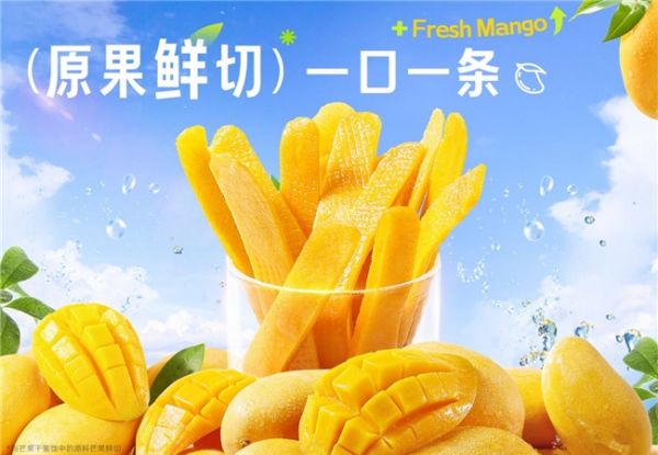 在精准对接消费需求方面,百草味对芒果干与芒果条进行了细致的差异化定位。精选芒果干,通过独特的横切工艺,保留了芒果的完整片状形态,分量充足,特别适合对食用量有一定要求的消费者。而创新的“一口芒果条”系列,则以“一口一条”的精巧设计不仅契合了现代人追求便捷与健康的消费趋势,还巧妙地辅助消费者控制食用量,让美味与健康得以共存。
