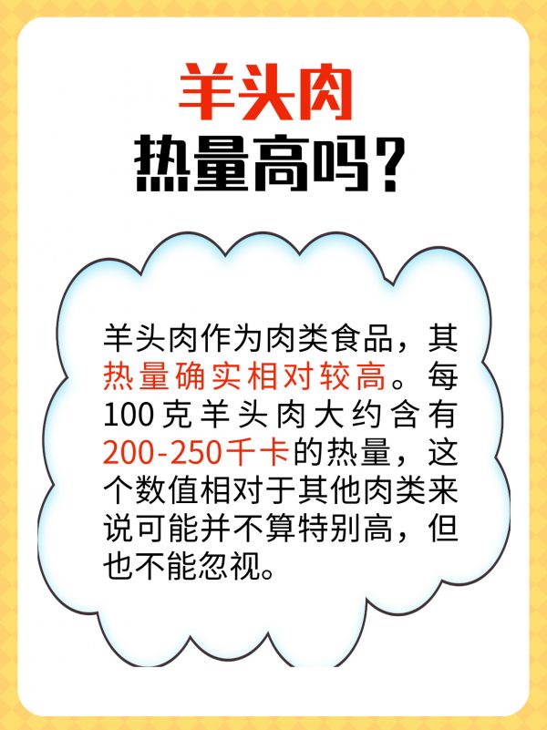 羊头肉作为肉类食品,其热量确实相对较高。每100克羊头肉大约含有200-250千卡的热量。
