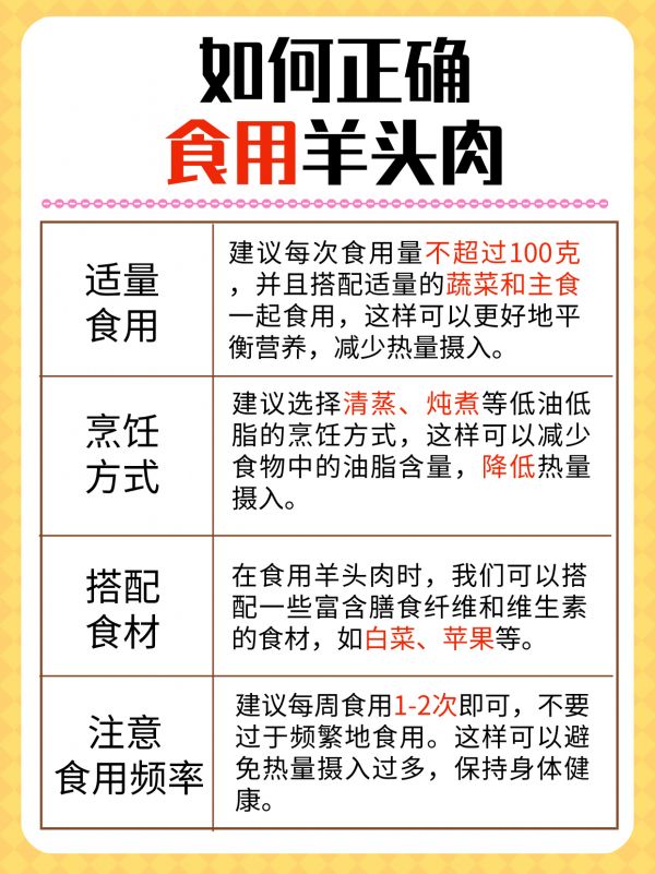 适量食用:对于羊头肉这样的高热量食品,我们更应该注意控制摄入量。建议每次食用量不超过100克,并且搭配适量的蔬菜和主食一起食用,这样可以更好地平衡营养,减少热量摄入。