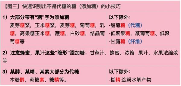 那如何快速辨认出配料表里的糖哪个是代糖,哪个不是呢?下面图三可以作为参考。