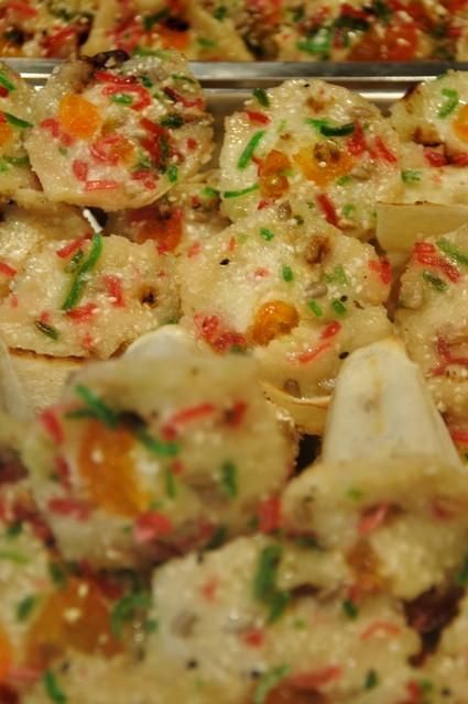 材料和制作:主要原材料为面粉、元宵、小青红果、果仁等配料,加入豆瓣酱、果酱、坚果等配料,外脆内软,面粉和豆熟酱完美融合,馅料饱满。