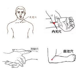 天突穴位于颈部,前正中线上胸骨上窝中央。内关穴位于前臂掌侧,曲泽与大陵的连线上,腕横纹上2寸,掌长肌腱与桡侧腕屈肌腱之间。列缺穴位于前臂桡侧缘,桡骨茎突上方,腕横纹上1.5寸,肱桡肌与拇长展肌腱之间。曲池穴位于肘横纹外侧端,屈肘,尺泽与肱骨外上髁连线中点。