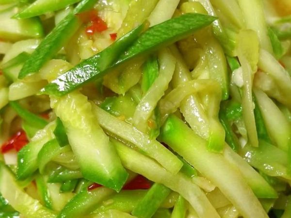 1、嫩南瓜表面淋湿,撒上食盐搓洗一会儿,清洗干净后切成丝备用。小米辣去蒂,洗净后切成丝。大蒜拍扁,切碎备用。