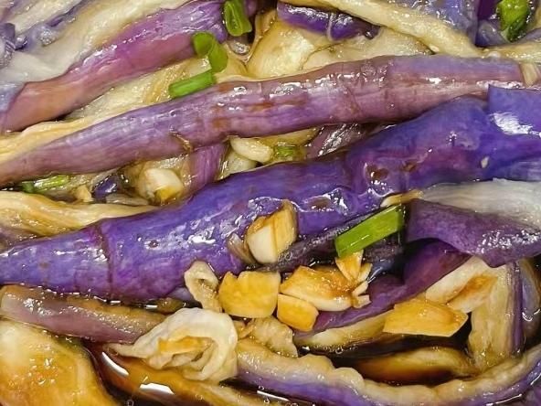 4、茄子蒸熟后取出来,撕成条放在盘中,倒入提前备好的凉拌汁,搅拌均匀后切撒上葱花点缀,即可端上桌开吃。