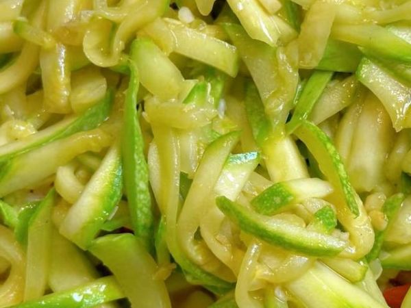 2、起锅烧油,油热后放入蒜末和小米辣炒出香味,再放入西葫芦丝翻炒一会儿。