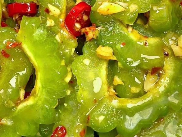 4、把凉拌酱汁倒入苦瓜中,搅拌均匀即可端上桌开吃。