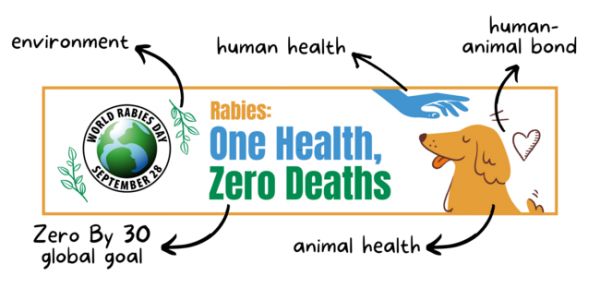 “同一个健康”主题的设计具有包容性,确保每个人(无论你是专业人士还是对狂犬病感兴趣的公众成员)都认为自己是一个不可或缺的合作伙伴,可以做出改变,并帮助我们作为一个集体实现消除狂犬病的目标。这一主题背后的精神是鼓励合作、伙伴关系和共同采取消除狂犬病的措施,以符合“30年前零死亡”:到2030年消除由狗引起的人类狂犬病死亡的全球战略计划。