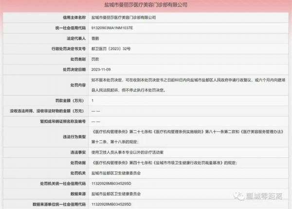 公开资料显示,2023年11月9日,盐城曼丽莎曾因使用卫技人员从事本专业以外的诊疗活动案,被盐城市盐都区卫生健康委员会处以1万元罚款。