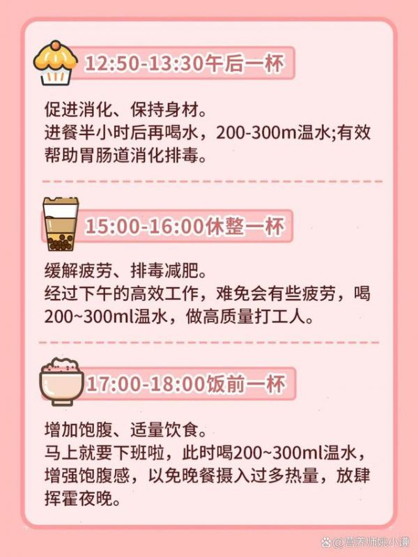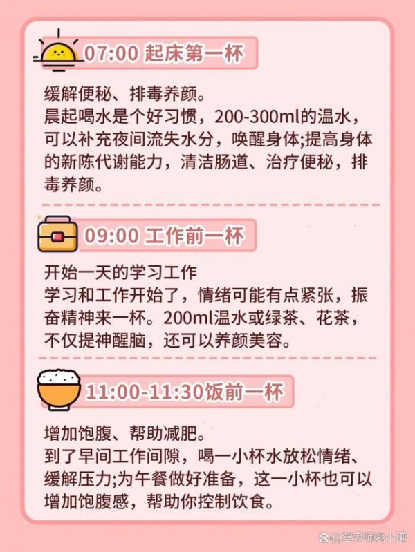 首先,关于喝水的时间,我建议大家在起床后立即喝一杯温水。这样可以帮助身体唤醒,促进新陈代谢,加快脂肪消耗。接着,在饭前半小时再喝一杯水,这样可以增加饱腹感,减少摄入量。而在饭后一小时再喝一杯水,则可以帮助消化和排毒。