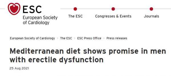 2021年8月25日,希腊雅典大学的研究人员在欧洲心脏病学会2021年度大会" 2021ESC "上发表的一项题为" Mediterranean diet shows promise in men with erectile dysfunction "的研究。
