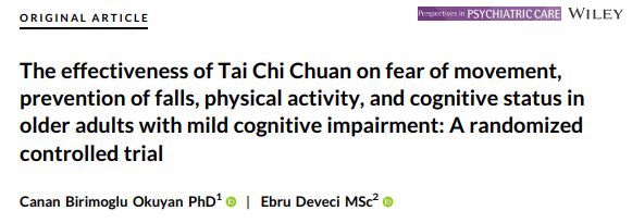 Birimoglu Okuyan C, Deveci E. The effectiveness of Tai ChiChuan on fear of movement, prevention of falls, physical activity, andcognitive status in older adults with mild cognitive impairment: A randomizedcontrolled trial. Perspect Psychiatr Care. 2021 Jul;57(3):1273-1281. doi:10.1111/ppc.12684. Epub 2020 Nov 13. PMID: 33184928.