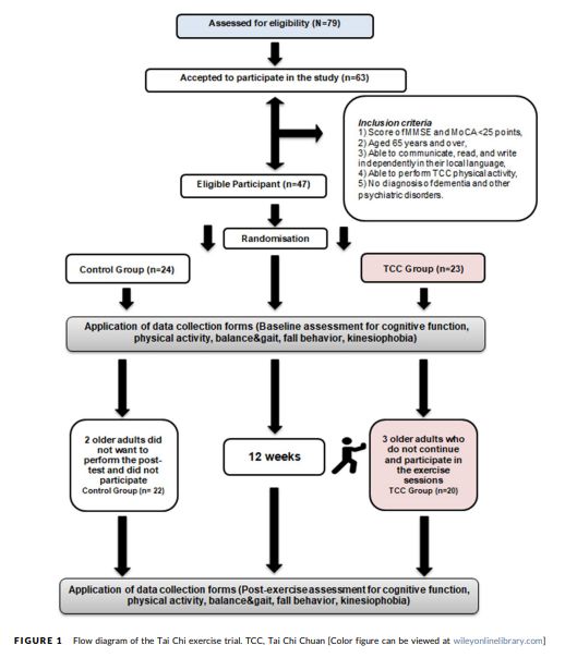 本研究的纳入标准如下:(1)MMSE和MoCA分数<25分;(2)土耳其人,年龄大于等于65岁;(3)能够使用当地语言进行交流、阅读、和写作;(4)能够进行太极拳运动;(5)没有老年痴呆和其他精神疾病的诊断。