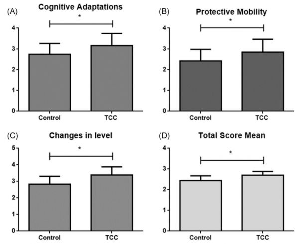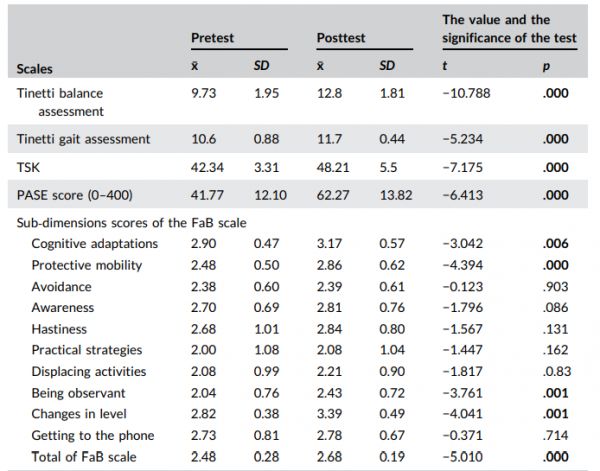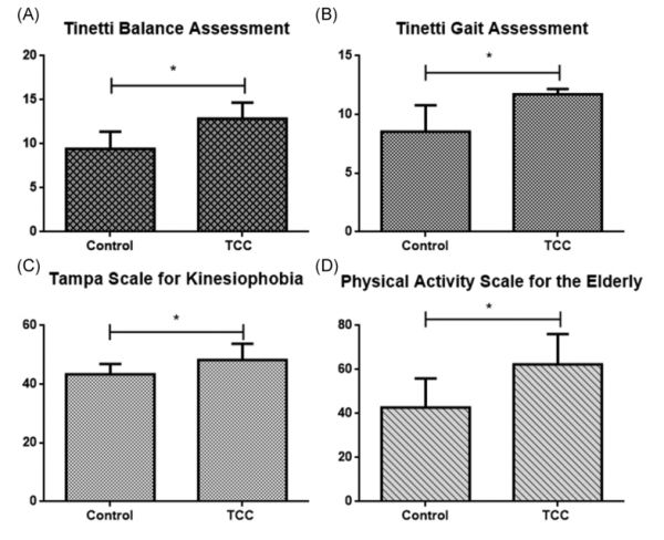 老年人最常见的问题包括运动恐惧和跌到相关的平衡失调,这些影响了他们的日常活动和社会关系。进行太极拳运动的干预组老年人的TAT评分增加,对运动的恐惧减少,身体活动水平(PASE)的增加。这些结果表明,由于太极拳训练,老年人跌倒的风险降低,与跌倒相关的保护性行为增加,身体运动水平增加。身体活动可能对MCI患者的认知状态有积极的影响。之前的研究表明,轻度认知障碍老年人的身体活动的下降可能会增加阿尔茨海默氏症的风险。因此,增加体育锻炼可以预防老年人认知功能障碍的发展。最近的一项研究也表明太极拳是达到这一目标的最佳运动之一,可以通过帮助改善关节运动和姿势的锻炼来实现平衡。据报道,老年人在太极拳运动后平衡性和步态得到改善。特别是,杨式太极拳在增加老年女性的骨骼肌肉灵活性方面非常有用。如太极拳这样的平衡运动可以改善老年人静态、动态的平衡以及行为表现。在另一项研究中,观察到阻力训练不能改善姿势控制,但平衡训练可以改善老年人的姿势。在他们的研究中,sangaji等人将40名多发性硬化症患者分为四组,并对这些组采用不同组合的有氧运动和阻力运动。在研究结束时,有氧运动组在平衡、力量、敏捷性、疲劳、速度和步行距离方面获得了更有利的结果。运动恐惧会导致老年人回避身体运动和活动,因为他们认为运动会再次造成伤害。在本研究中,与对照组相比,干预组对运动的恐惧更少,这表明有规律的锻炼习惯降低了老年人对运动的恐惧。