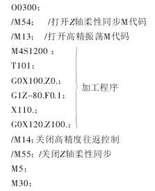 MTB<Gn197.1>B组柔性同步信号 。在本例中执行M54,MTA<Gn197.1>为“1”;在本例中执行M55,MTA<Gn197.1>为“0”。此信号为输入信号,其为1时柔性同步开启,其为0时柔性同步关闭。同时对应的M代码数值需要设置到参数中。并且高精度往返控制以及柔性同步的开关顺序为:打开柔性同步→打开高精振荡→加工动作→关闭高精振荡→关闭柔性同步。