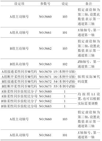 柔性同步控制在车削断屑中的重要目的为将虚设轴的振荡动作与伺服轴的正常指令进行叠加,从而实现断屑的效果。控制中以虚设轴A轴作为其主动轴,需要进行振荡的伺服轴设置为从动轴,最多可以设置4组。柔性同步控制同样为选项功能,0i-TF中订货号为A02B-0339-S709,诊断号为1292#0。31i B系统订货号为A02B-0327-S709,诊断号为1268#1。下面设置以标准车床为例,设置两组振荡轴,其设置如表3所示。