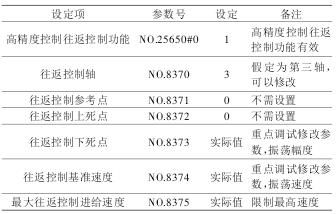 因为最终需要将高精度振荡动作叠加在实际的轴移动中,所以一个虚设的轴是必须的。基本设置可以按照表1进行,其中特别需要注意的为虚设轴需要将返回参考点动作取消,同时对应的速度信号需要进行设置,表1中虚设轴设置为A轴。