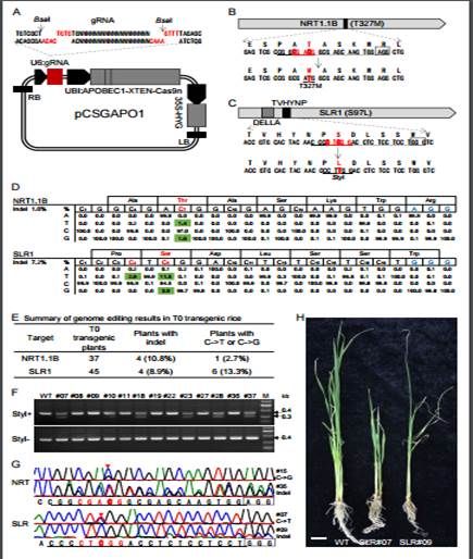 逆境中心朱健康研究组基于APOBEC1功能,在水稻中开发了一种新的碱基编辑系统。研究人员合成了APOBEC1,并利用XTEN作为接头,将其融合到Cas9(D10A)的N末端,同时将核定位信号肽(NLS)添加到Cas9(D10A)的C末端。改造后半激活式的Cas9可切割非编辑的那条链,并通过诱导碱基切除修复(base-excision repair)解决U:G的错配,从而实现高效的碱基替换。研究人员通过对两个编码重要农艺性状的水稻基因NRT1.1B和SLR1进行单碱基C→T或C→G的单碱基编辑,单碱基替换的效率为1.4%-11.5%,与在动物中的编辑效率相似(1.6%-3.9%)。但同时也发现,在水稻稳定遗传转化系统中,有大约10%的序列显示核苷酸的插入。