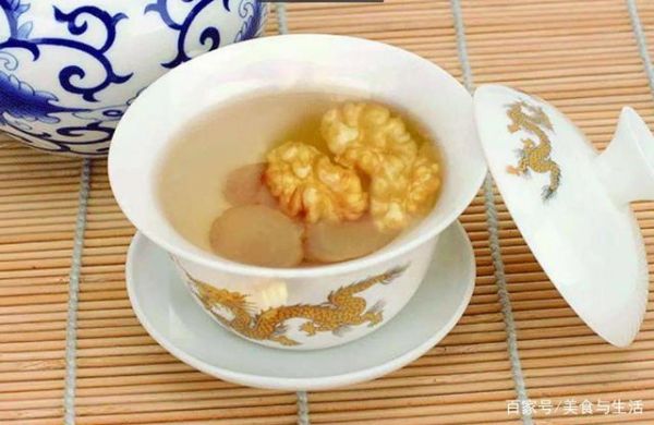 取三克人参洗净切片,取核桃仁十克洗净,然后将其放入砂锅中加入适量的清水,用大火烧开后用小火熬制一小时,人参核桃茶就熬制成功了。