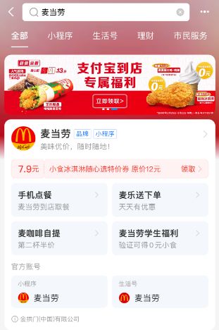 领取方式:支付宝APP-搜索【麦当劳】-进入广告页面,即可领取0元优惠券