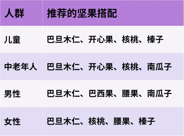 吃坚果的时候,最好是4种以上,搭配着吃或换着吃,这样营养会更均衡,口感也更好。小薇根据不同人群每日的营养需求,筛选出了适宜的坚果搭配,可供大家参考。