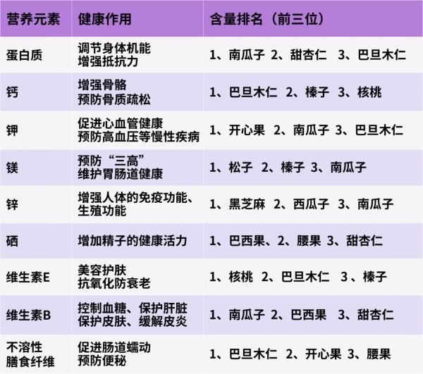 不同的坚果富含的营养元素各有高低,综合营养最全面的是这四种:巴旦木仁(扁桃仁)、南瓜子、核桃、榛子(山板栗)。