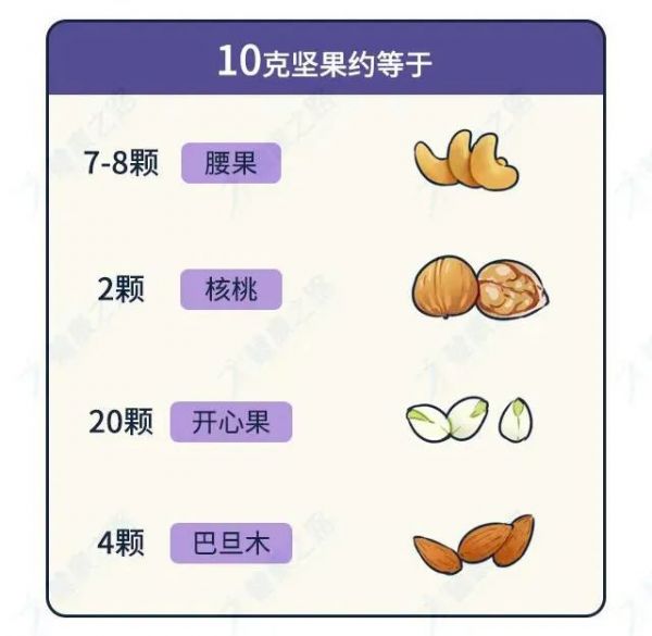 坚果的脂肪含量很高,许多人吃的时候不注意控量,一次吃完一整包,自然容易升高血脂。建议成年人每周摄入50~70克的坚果即可,换算成每天大概的量,就是10克左右,大家可以参考下图: