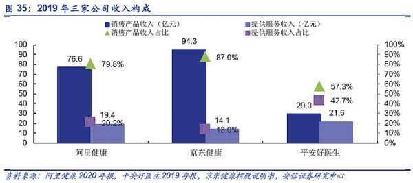 平安好医生则是从医疗服务切入,辅以药品销售,两者营收比例比较接近。但总规模相对较小,所以市值三者最低。