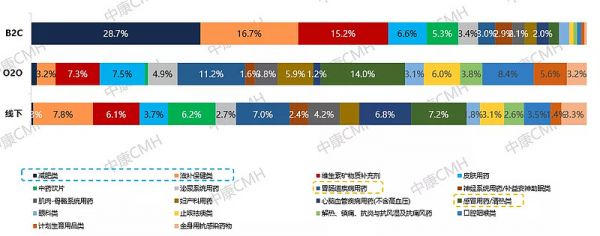 对比各渠道的药品品类结构,O2O渠道显示出“急懒夜私”的场景特性,感冒、胃肠道、咽喉、计生、ED品类占比明显大于零售门店总体品类占比。而消费者在B2C渠道更聚焦在保健养生类等非急性和弱治疗性的产品,减肥药、滋补保健类、维生素矿物质补充剂在B2C药品的占比超60%。