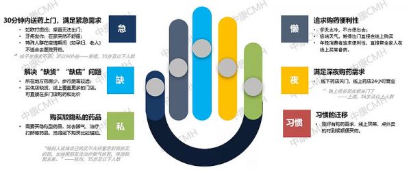 当前无论是医药B2C、O2O还是线下药店发展都必须需要参与者最大程度上满足消费者的需求,也就是需求端与供给端的无缝对接,使消费者得到最好的体验,增强消费者黏性。消费者对医药的需求包含了实惠的价格、快速取货、多元化品类、优质服务以及品牌。
