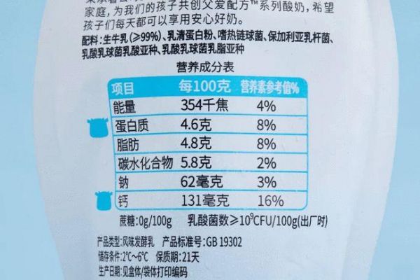 此外,它的钙含量也非常优秀,每袋 100 g 的酸奶钙含量高达 131 mg,NRV% 值是 16%。要知道食品中,每 100 g 达到 15% NRV 的钙就是「高钙食品」了。