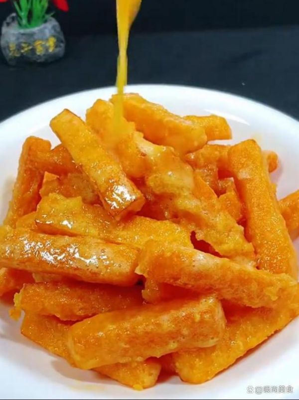 3、锅留底油,放入一勺海鸭蛋黄酱,小火炒至冒泡泡,放入适量白糖,下入炸好的南瓜翻炒均匀出锅即可。