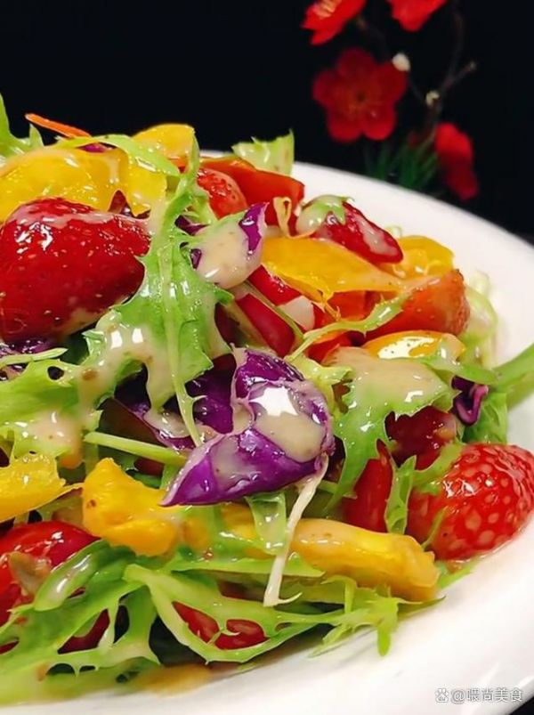 准备食材:苦菊、草莓、樱桃小萝卜、紫甘蓝、玉米粒、沙拉酱