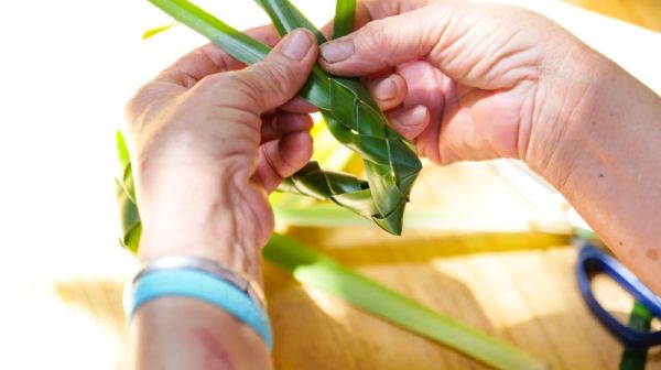 一个鸭乸粽需要通过四片细长的簕古叶交错编织成鸭头、鸭脖、鸭身、鸭尾形状。