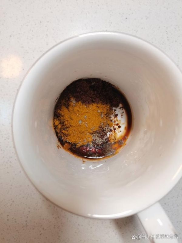 2. 杯中加入2勺黑咖啡粉、1小勺姜黄粉、3克黑胡椒粉