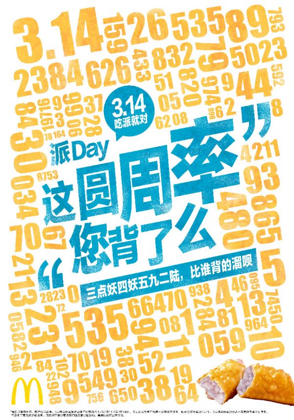 自 2015 年起,麦当劳把「节日」的概念与意义,沿袭到品牌与粉丝的互动中,独创了「麦麦粉丝节」。除了「大薯日」, 「麦麦粉丝节」还包括了 3 月 14 的「派 day」,粉丝与顾客在这天会用麦当劳的经典小食派来庆祝圆周率的诞生。麦当劳通过打造一个属于自己的粉丝节,将爱好者聚拢形成品牌社区;再用年轻人喜欢的互动方式与其沟通,形成了一种独特的品牌文化——大暑这天要去麦当劳吃薯条,3 月 14 日麦当劳的派也不可少。