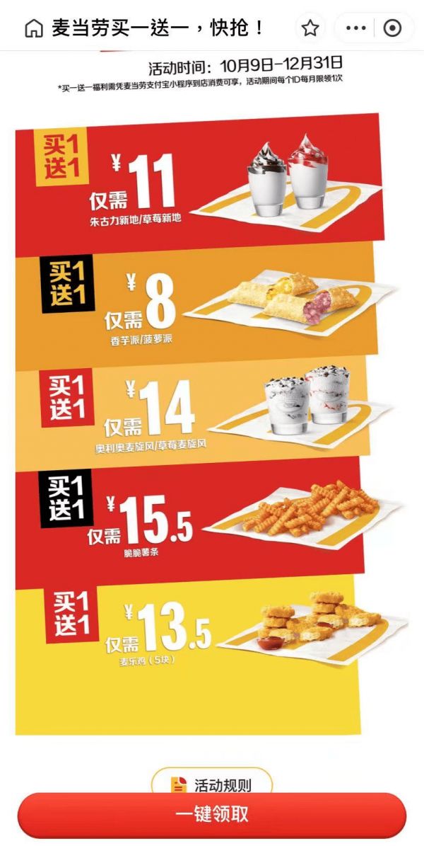 8元派买一送一优惠券1张 14元麦旋风买一送一优惠券张 15.5元脆脆薯条买一送一优惠券1张 13.5元麦乐鸡买一送一优惠券1张 11元新地买一送优惠券1张
