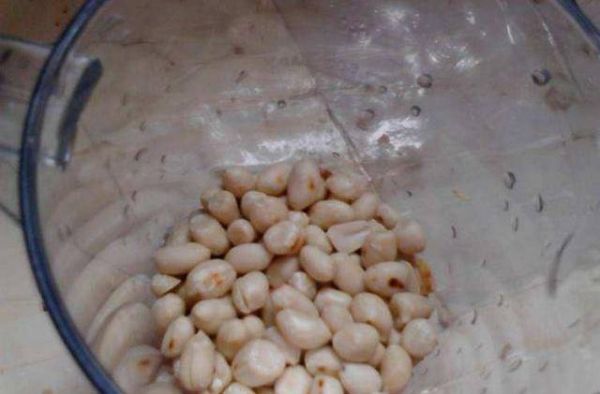 3、去皮后,把花生仁放入料理机里面搅打,搅打到花生粘成块再取出