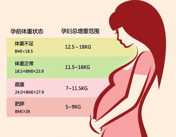 例如,孕前体重是62kg,身高165cm,BMI=62/ 1.65⊃2; =22.8,属于正常体重,那么整个孕期总的增重应该在11.5-16kg之间。