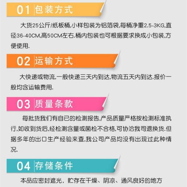 斯诺特生物生产各类果蔬粉,自有生产工厂,厂家资质齐全(SC认证,企标,三方检测报告),可免费提供样品用于客户产品调试,随货带检测报告。巴西莓外文名为Euterpe badiocarpa、Euterpe oleracea,属棕榈科,树身长苗条,多达15-25公尺高,树干直径约10-15公分,开棕色与紫色花,叶鞘带有红色,成熟的巴西莓果会由绿转紫色,大小约1-2 公分直径,一粒粒排列于每一叶鞘。 【产品名称】巴西莓果粉 巴西莓提取物 【英文名称】Brazilian Acai berry powder 【拉丁学名】BrazilianAcai, acai berry 【提取来源】为木兰植物八角茴香Illicium verum Hook.f.的果实。 【有效成分】富含棕榈酸,亚油酸,谷甾醇,花青素以及香草酸,多种黄酮类化合物。 【产品规格】10:1 20:1(可根据客户需求定制生产) 【产品性状】紫红色精细粉末 【生产工艺】原料清洗、提取(水/乙醇)、过滤、浓缩、喷雾干燥、过筛、包装 【包装】标准包装:25kg/纸板桶;散货:1kg/袋 【储存】置于阴凉干燥处,密封保存。 【保质期】2年 【产品应用】可用于食品饮料、调味品、宠物食品、饲料等。 公司拥有目前提取、分离纯化、检测设备。从原料种植、生产到包装运输全过程都制定了质量控制办法。 公司介绍: 扶风斯诺特生物科技有限公司位于中国陕西省宝鸡市扶风县绛帐科技工业园。公司占地约40亩总投资6500万元建筑总面积26667平方米。建设提取物生产线购置安装现代化智能设备以及饮料和糖果制品生产线建成原料、辅料、包装材料及成品库房、变电站、污水处理站等公用配套设施以及研发、质检、行政办公综合楼等。拥有目前国内提取、分离纯化、检测设备。从原料种植生产、包装到运输等全过程公司都严格制定了质量控制办法。检测部配有进口高效液相色谱仪(HPLC)、高效气象色谱仪(GC)、紫外-可见分光光度计(UV)、快速水分测定仪等全套检测设备全面控制产品含量、重金属、微量元素、微生物等各项质量指标。厂内生产设备齐全,产品中类丰富,中草药提取物、果蔬粉、多肽粉、五谷杂粮粉、酵素粉、浸膏粉等产品应有尽有,同时支持定制生产或来料加工。工厂所有工人必须着工作服进行生产,厂区生产区域会定期进行消毒,保证厂区环境卫生安全,为人类健康事业保驾护航,确保把安全健康的原料交到您的手上。 斯诺特库房展示: 十余年老厂、质量稳定有保障,大量库存,长期供应,确保快速及时把货物交付到客户手上,让客户用上放心安全的原料。 各种包装展示: 产品应用 扶风斯诺特生物始终坚持: 经营宗旨:以德立业,益善为本,自强开发,务实创新,产业报国。 科学理念:开发于自然,忠实于科学,献身于健康,诚信于客户。 1、成品均匀细致,性状稳定,溶解性好,水分含量低,可以延长贮藏期,降低贮藏、运输、包装等费用; 2、原料的利用率高,它对原料的要求不高,特别是对原料的大小、形状没有要求; 3、纯度高,品质保证、颜色天然、水溶性好、不分层、 不添加防腐剂、香精、色素。 客户须知: 欢迎新老客户前来咨询采购!