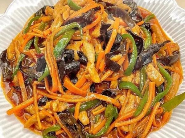 (6)再放入胡萝卜、黑木耳、青椒丝,翻炒至断生,再放入肉丝,倒入调好的鱼香汁,大火翻炒均匀,至汤汁浓稠食材熟透。