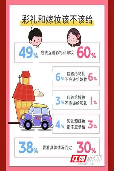 在“份子钱”的最终归属上,未婚青年则是相当“淡定”,仅约四成受访者认为“份子钱”应该全部归新人所有,其余受访者则倾向于给父母或者用以支付婚礼花销等。此外,在 “如何决定彩礼/嫁妆数额”这个问题上,未婚青年对此的回答也很“淡定”:各管各的。据《报告》,近七成未婚青年都认为,应该由男女双方根据自己家那边的习俗决定数额。