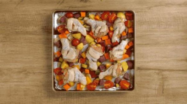 3.烤盘铺锡纸,把拌好的蔬菜放上面,把鸡翅放到蔬菜上。