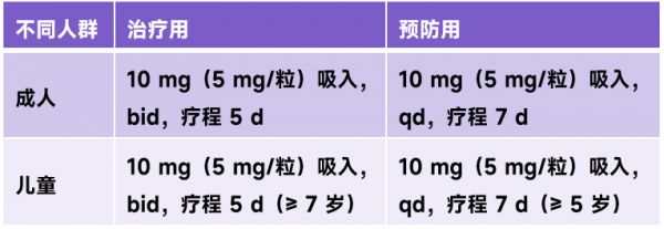 用法用量:300~600 mg 静脉滴注,qd,疗程 1~5 d(重症病例可适当延长);需要注意的是,目前尚无帕拉米韦预防性用于流感患者的报道 [6]。