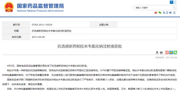 2013 年,国家药品监督管理局批准帕拉米韦用于治疗甲型和乙型流感,并指出,帕拉米韦氯化钠注射液对于那些流感重症患者、无法接受吸入或口服神经氨酸酶抑制剂的患者和对其他神经氨酸酶抑制剂疗效不佳或产生耐药的患者提供了新的治疗选择 [12] 。