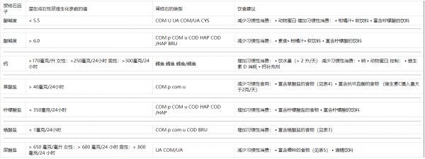 表2尿结石因子、肾结石类型和饮食建议之间的关系