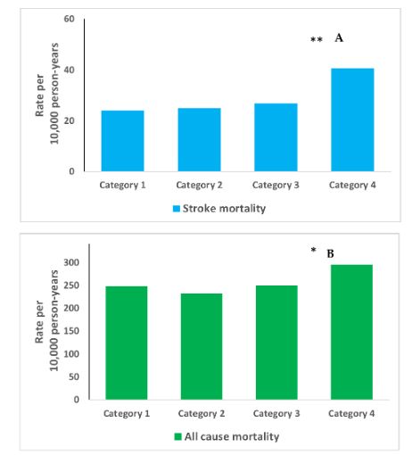 图1 不同婚姻满意度类别的中风率和全因死亡率。
