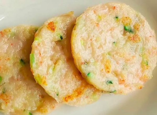 1- 虾仁剁碎,胡萝卜、西兰花切丁。所有蔬菜焯水后与虾仁混合,加入鸡蛋、全麦面粉、盐、黑胡椒搅拌均匀。