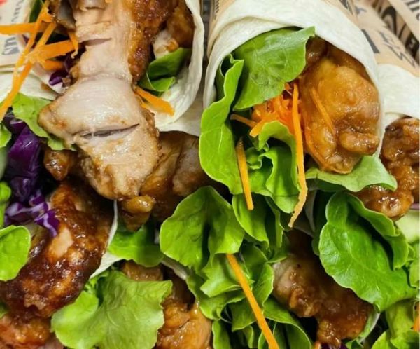 2- 取一片生菜叶,铺上鸡肉丝和各种蔬菜丝,放上几片薄荷叶,卷起固定。