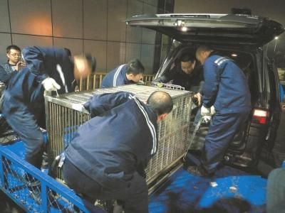 经过近一个半小时的空中旅行,刚下飞机的“蜀兰”还有一点惊慌。面对机场运输工作人员,她有些焦虑地在笼子里转来转去,变换姿势。