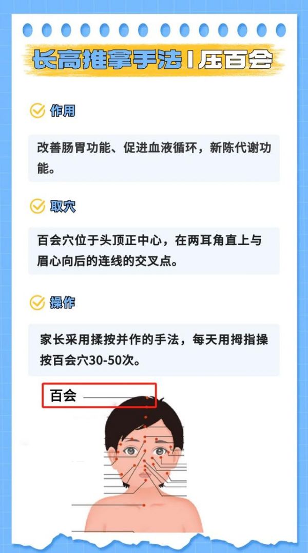 穴位按摩,可以疏通经络,增加气血营养,促使新陈代谢加速,有利于骨骼发育,从而帮助长高。